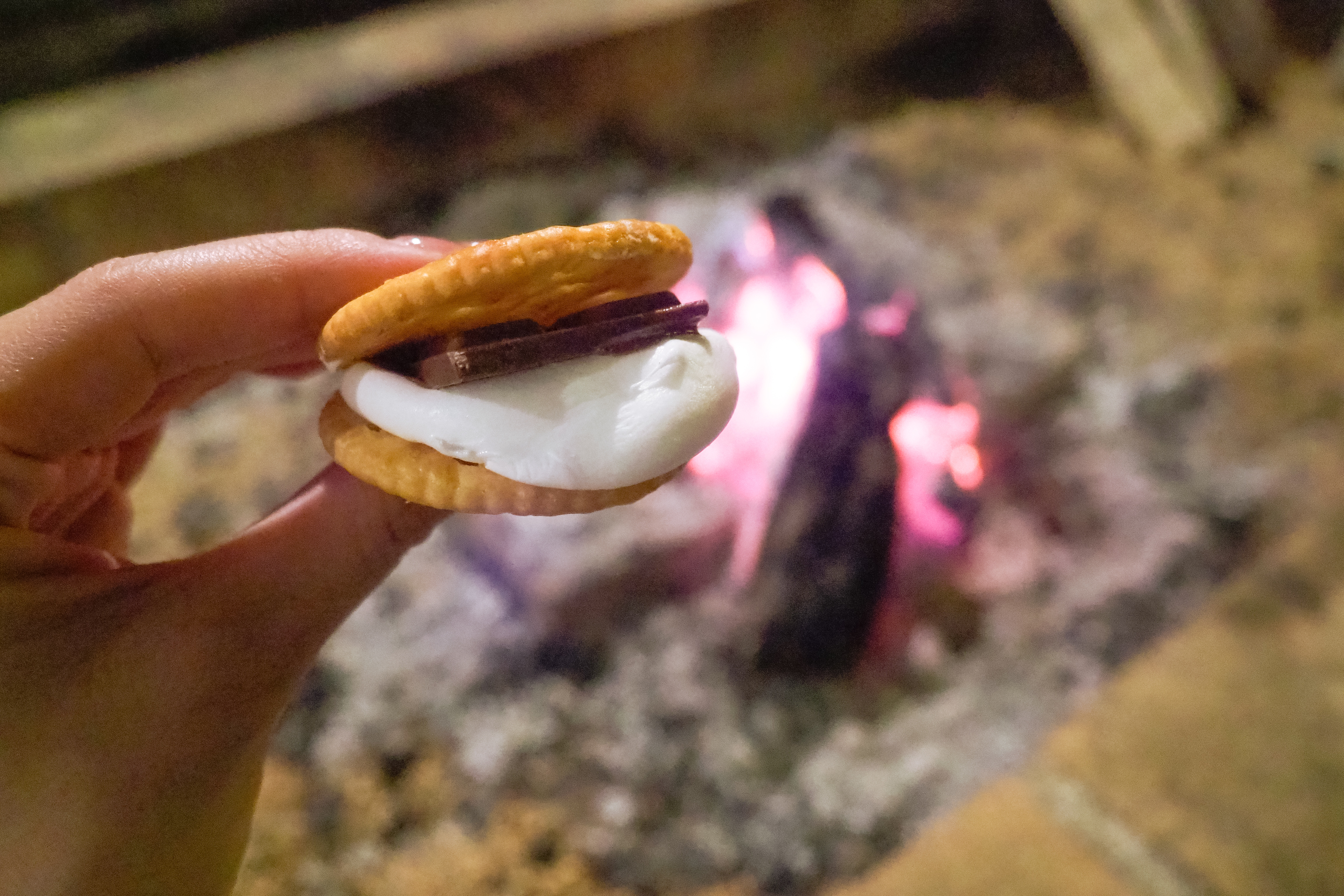 焼きあがったマシュマロは、クラッカーとチョコで挟んでスモアにしてお召し上がりいただけます。体も心も温まるひとときです。